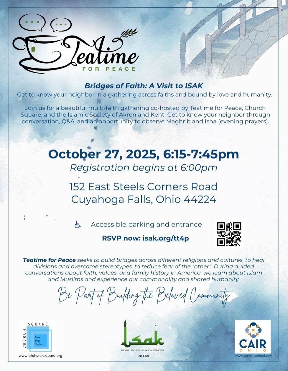 Join us for a beautiful evening as ISAK hosts Teatime for Peace! This is a special opportunity for the Muslim community to welcome guests of different faiths into our masjid, share the beauty of Islam, and represent our community with warmth and kindness.