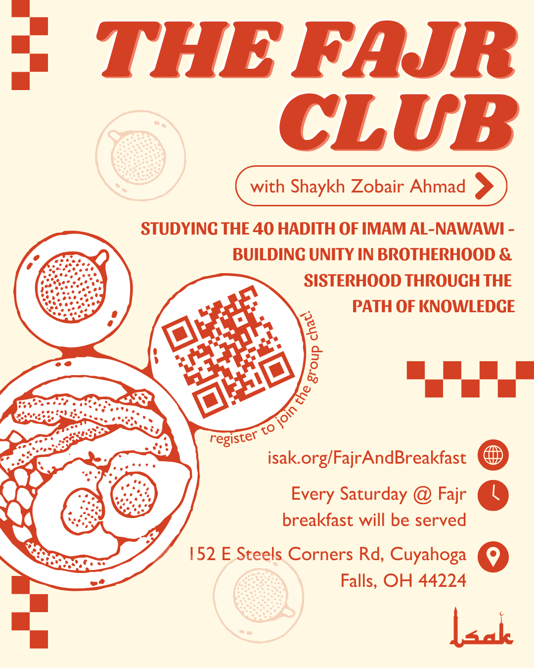 Join us for The Fajr Club, a weekly gathering centered around reflection, learning, and community. Together, we’ll explore the timeless wisdom of Imam al-Nawawi’s 40 Hadith, focusing on how these teachings inspire unity, strengthen brotherhood and sisterhood, and guide us along the path of knowledge.