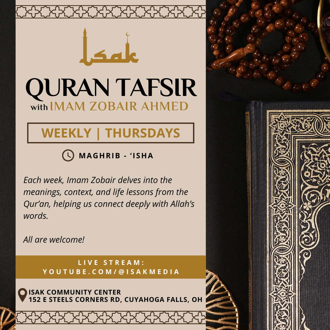 Join us every Thursday between Maghrib and ‘Ishā’ at ISAK for a spiritually uplifting Tafseer session with our beloved Imam Zobair Ahmed.