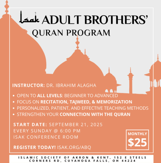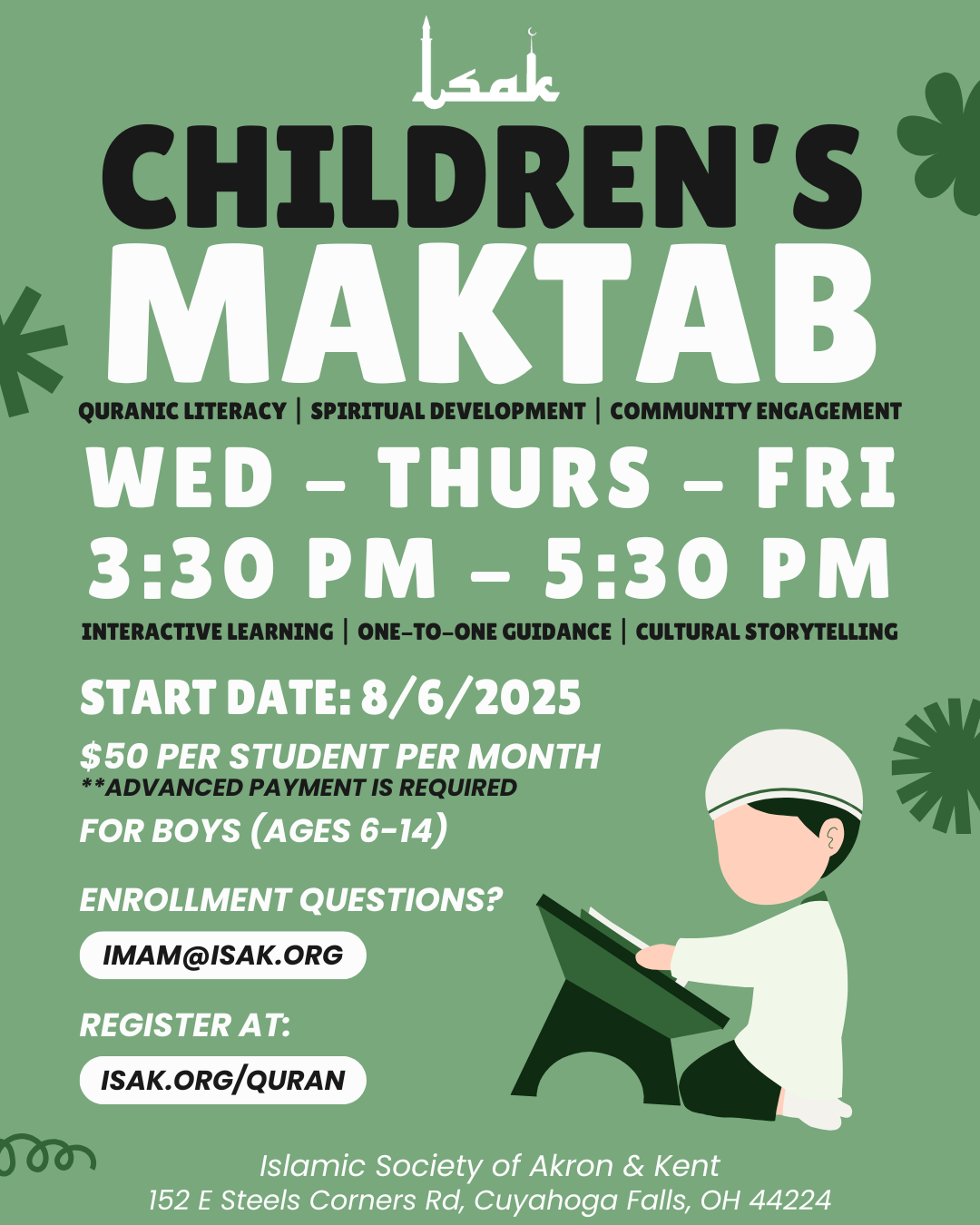 ISAK 152 E Steels Corners Rd, Cuyahoga Falls, OHChildren’s Maktab Program Date: Starts August 6th, 2024 Wednesday - Friday; 3:30 - 5:30 PM Location: Islamic Society of Akron and Kent, 152 E Steels Corners Rd, Cuyahoga Falls, OH 44224 Registration Link: isak.org/quran Enroll your children today for the ISAK Children’s Maktab program! The after-school program is designed to teach students to learn the skills needed for Qur’anic recitation with […]